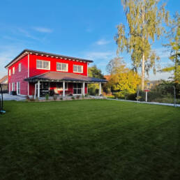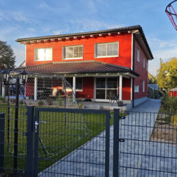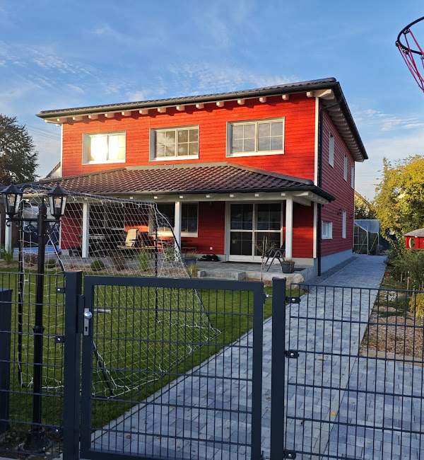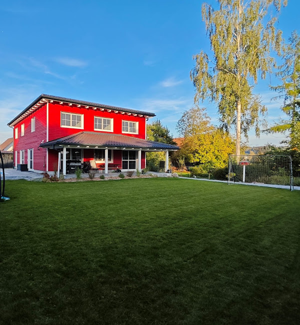 Das Einfamilienhaus in Villenbach wurde in Massivbauweise realisiert und überzeugt durch eine klare, zeitlose Architektur mit klassischem Walmdach. Die Holzfassade in einem markanten Rotton verleiht dem Gebäude einen eigenständigen Charakter, während großzügige Fensterflächen für helle und freundliche Innenräume sorgen. Die Gestaltung verbindet traditionelle Elemente mit einer modernen Formensprache.
