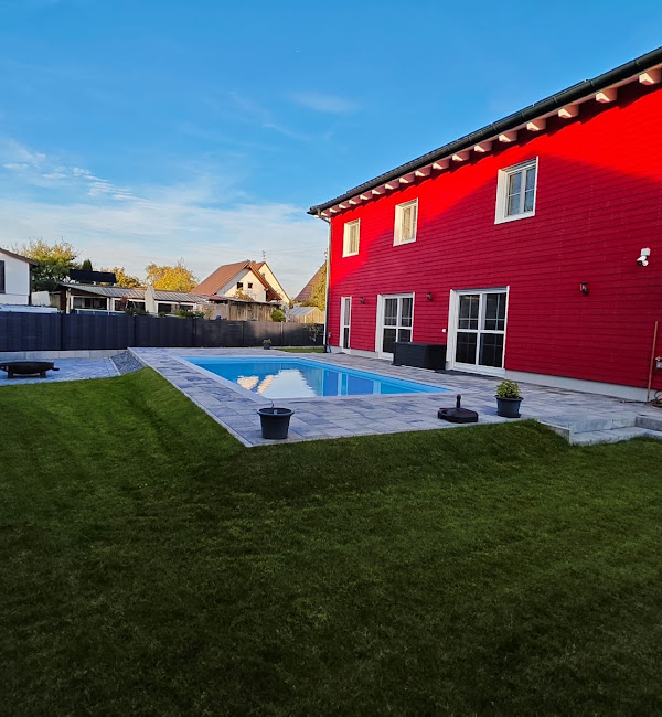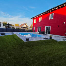 ObjektartEinfamilienhaus mit Holzfassade und PoolBaujahr2024Bauzeit10 MonateWohnfläche218 m²Außenmaße13,30 x 10,55 mDachformWalmdachGarageDreifach-GarageHeiztechnikFernwärme